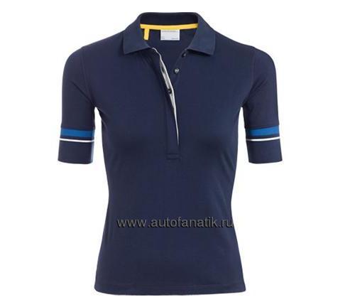 Женское поло с чуть более длинными рукавами, украшенными печатным принтом 911 и вязаными полосами. Скрытые кнопки. Материал: 100% хлопок. В темно-синием цвете.