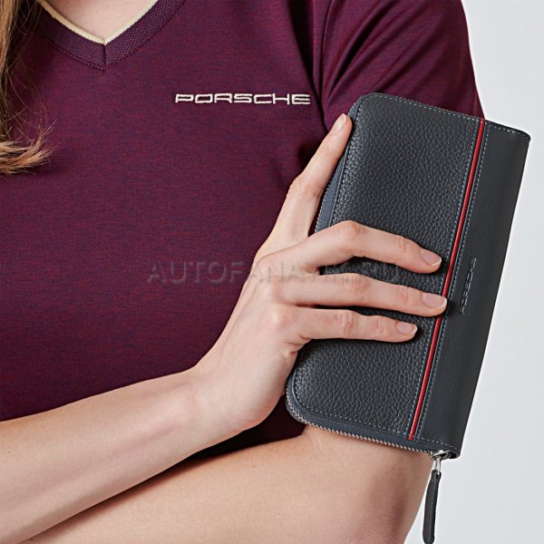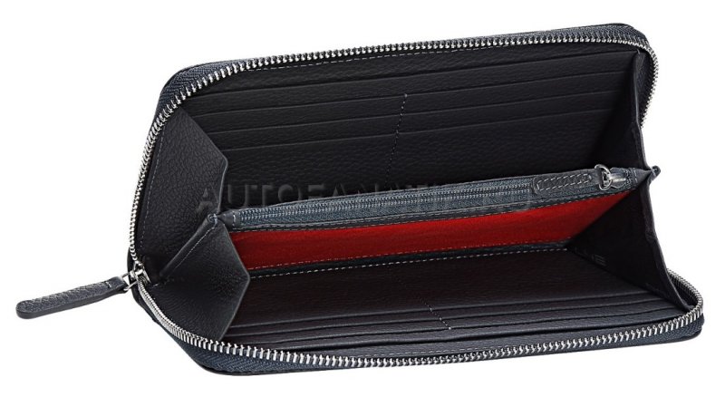 Кошелек из высококачественной кожи с тиснением Porsche, закрывается на молнию. Большое внутреннее отделение для монет на молнии и другие различные отделения. Два отделения для банкнот. Сделано в Европе. Материалы: 60% кожа, 30% полиэстер, 10% микрофибра. Цвета: Asphalt Grey с деталями цвета Bordeaux Red.