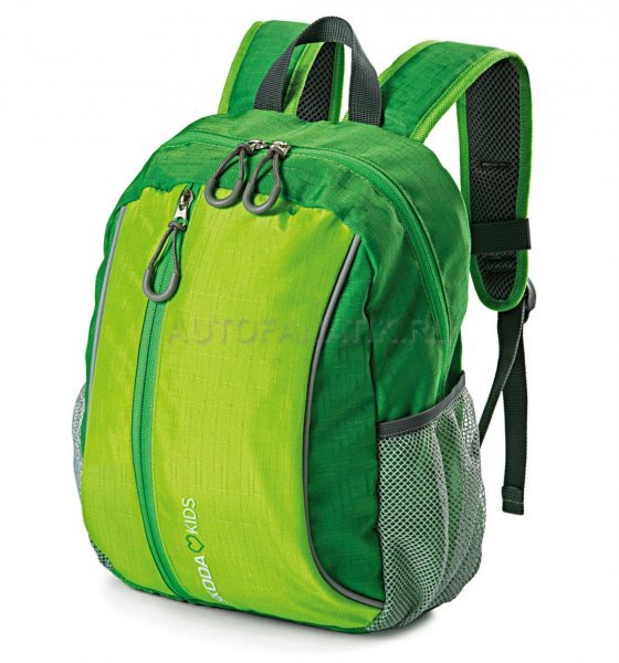 Яркий, привлектальный, многоцелевой детский рюкзак со светоотражающими элементами и логотипом ŠKODA Kids. Рюкзак оснащен большим основным отделением на молнии, меньшим карманом на молнии и двумя сетчатыми карманами. Для удобного ношения он снабжен мягкими плечевыми ремнями с отражающими вставками и нагрудным ремнем. Маленький карман с табличкой для имени ребенка зашивается внутрь рюкзака. Размер: 24 x 32 x 10 см., внутренний объем около 7 литров. Материал: полиэстер. Цвет: несколько оттенков зеленого.