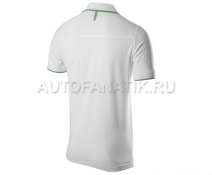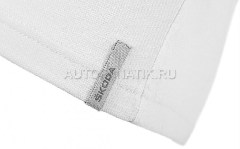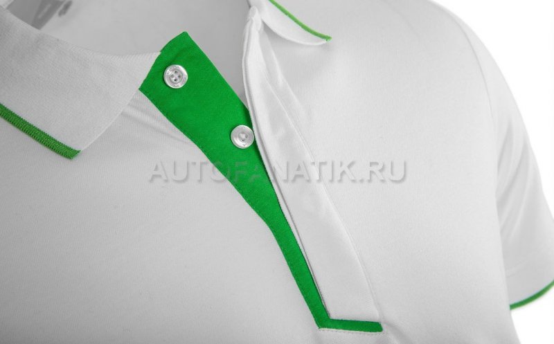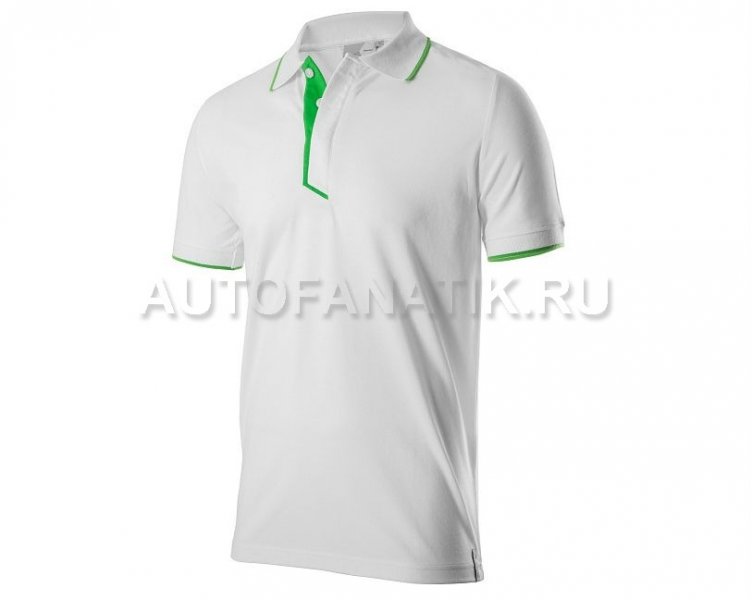 Мужская рубашка-поло белого цвета с традиционными для SKODA акцентами ярко-зеленого цвета. Неброская 3D-эмблема SKODA сзади в нижней части. Пристроченный серый лейбл SKODA сбоку слева. Материал: 97% хлопок, 3% эластан.