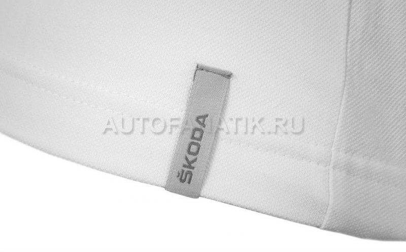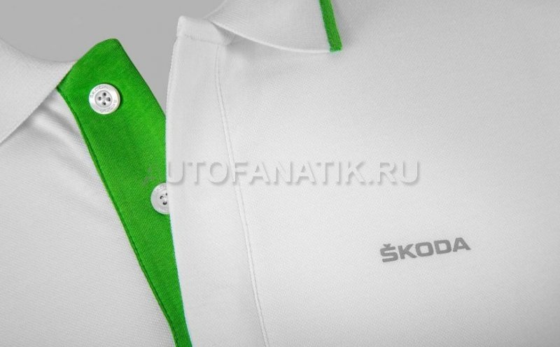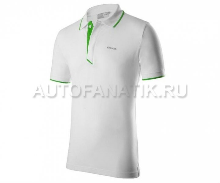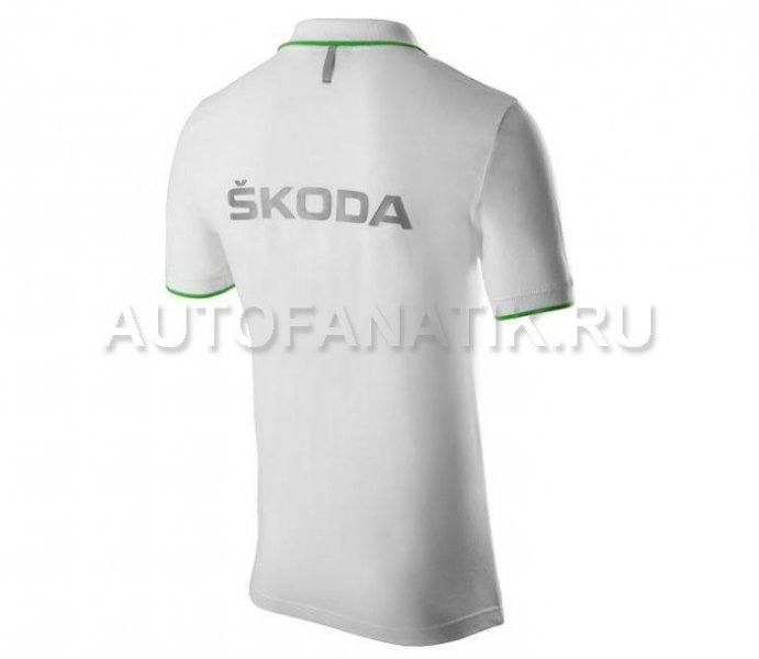 Мужская рубашка-поло белого цвета с зелеными элементами, с планкой на 3 пуговицы. Надпись Skoda на груди и крупный принт Skoda на спине. Гравировка Skoda на пуговицах. Материал: 97% хлопок, 3% эластан.