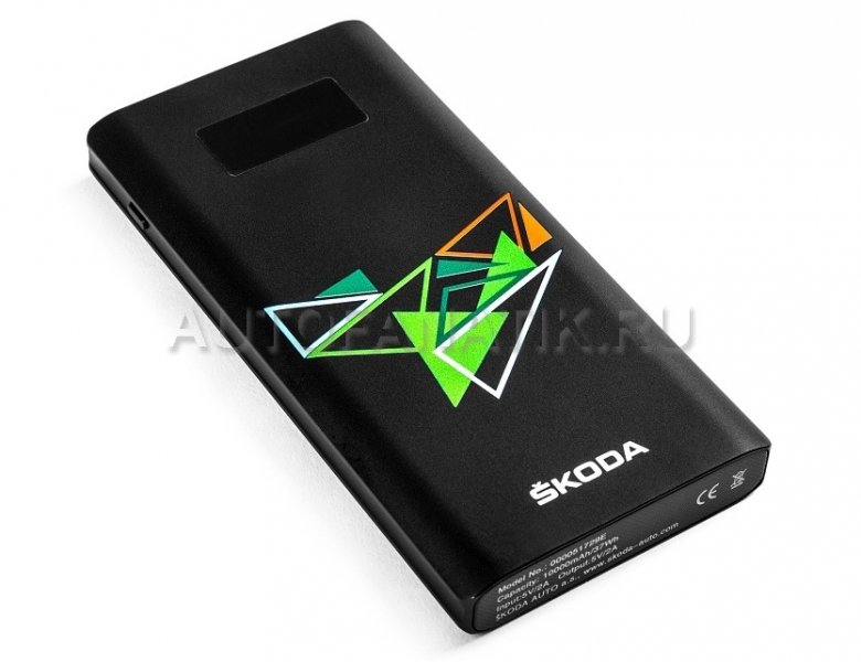 Металлический Power Bank с красочным мотивом с брендингом ŠKODA. Емкость 10 000 мАч. Он имеет два порта USB (micro USB и USB), слот постоянного тока 5 В и светодиодный индикатор состояния. Простая в использовании всего одна кнопка, можно заряжать с помощью прилагаемого USB-кабеля (USB-разъем - A / Micro USB + USB - C и Lightning).