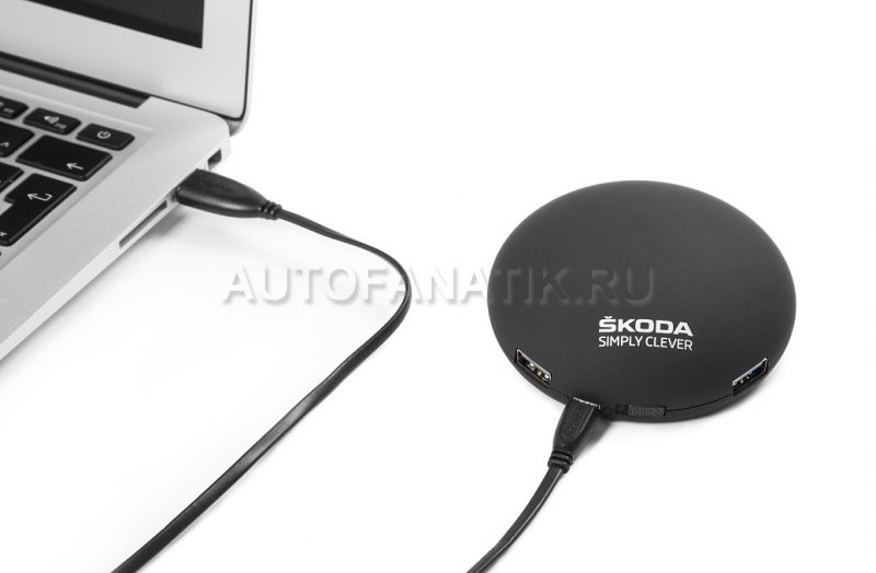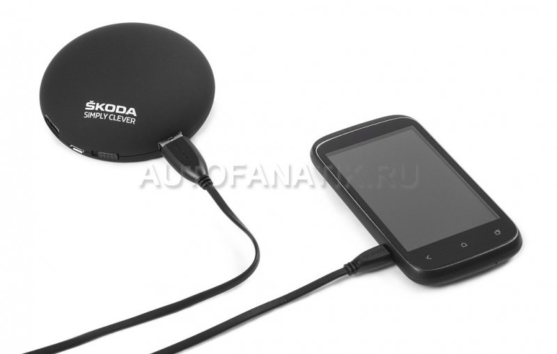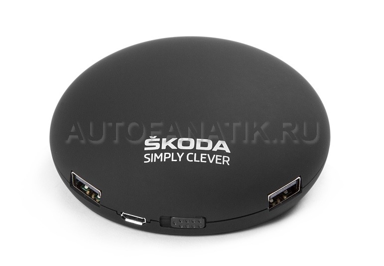 Внешнее портативное зарядное устройство, чёрного цвета, пригодится Вам каждый раз, когда будет нужно зарядить телефон, планшет или МР3-плеер без доступа к электричеству. Зарядное устройство украшено серебристой надписью ŠKODA Simply Clever и имеет два стандартных USB-порта. Устройство питается от 5200 мАч литиевой батареи и имеет светодиодный индикатор, информирующий об оставшейся мощности.
