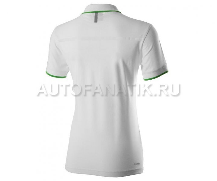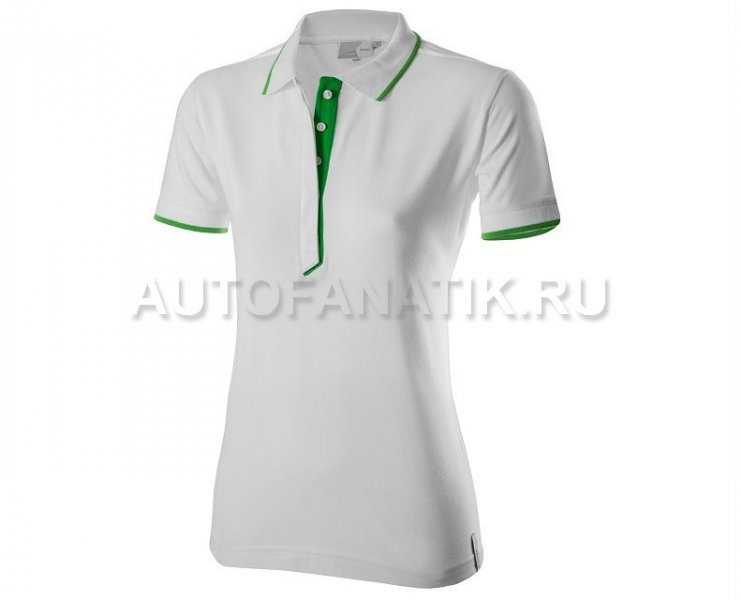 Женская рубашка-поло белого цвета с традиционными для SKODA акцентами ярко-зеленого цвета. Женственный приталенный силуэт, модная длинная планка, пуговицы с гравировкой SKODA. Неброская 3D-эмблема SKODA сзади в нижней части. Пристроченный серый лейбл SKODA сбоку слева. Материал: 97% хлопок, 3% эластан.
