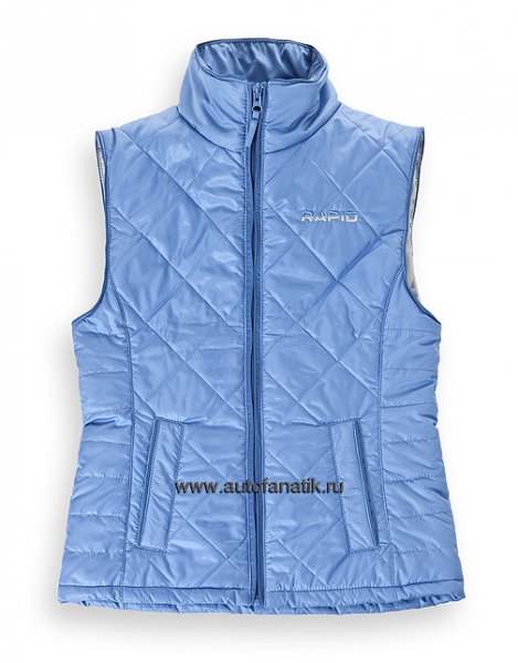 Элегантная женская жилетка "Skoda Rapid" из водоотталкивающего материала. Вышивка Rapid спереди. На молнии, спереди два кармана на кнопках, внутренние карманы на молнии. Размер регулируется с помощью ремешка и пряжки с логотипом. Цвет: голубой. Материал: 100% полиэстер.