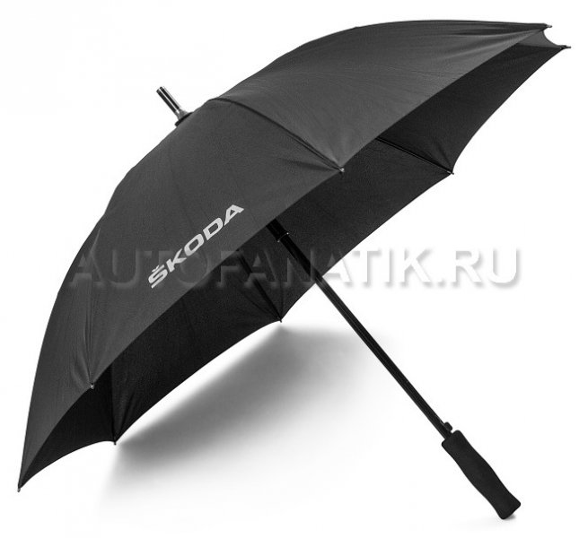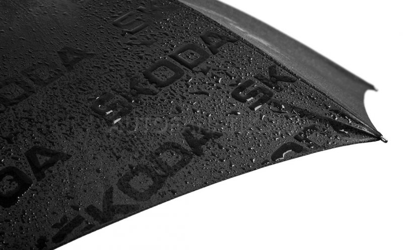 Черный зонт с эффектом Aquaprint. Если капли дождя падают на зонтик, на нем проявляется надпись Skoda. Материалы: полиэстер, стекловолокно, алюминий, пластик. Длина трости: 85 см., диаметр купола в открытом состоянии: 98 см.