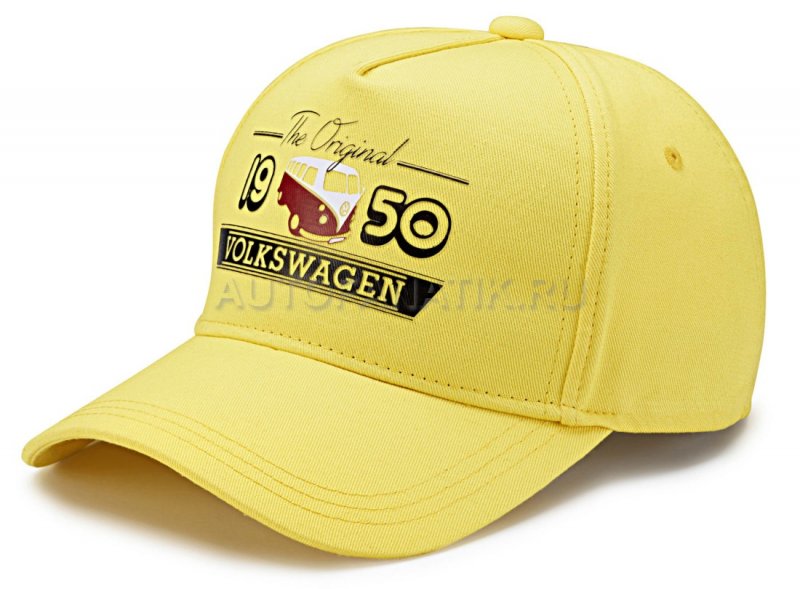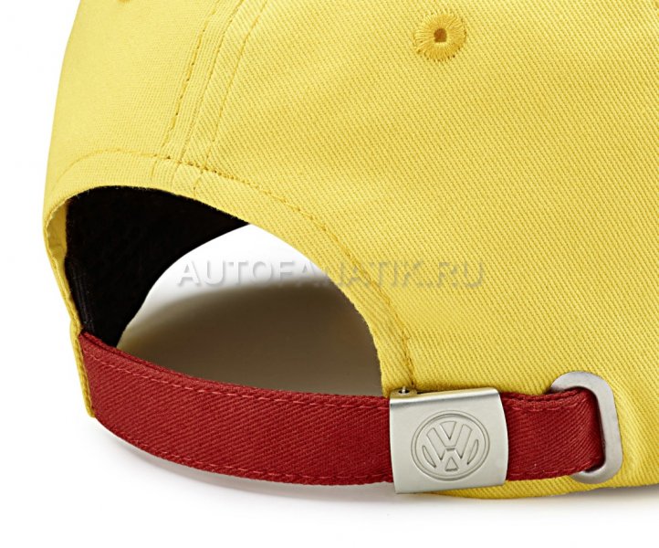 Желтая бейсболка из 100% хлопка, коллекция T1 Bulli. Размер регулируется элегантной тесьмой красного цвета и фиксируется металлической пряжкой с гравировкой эмблемы VW.