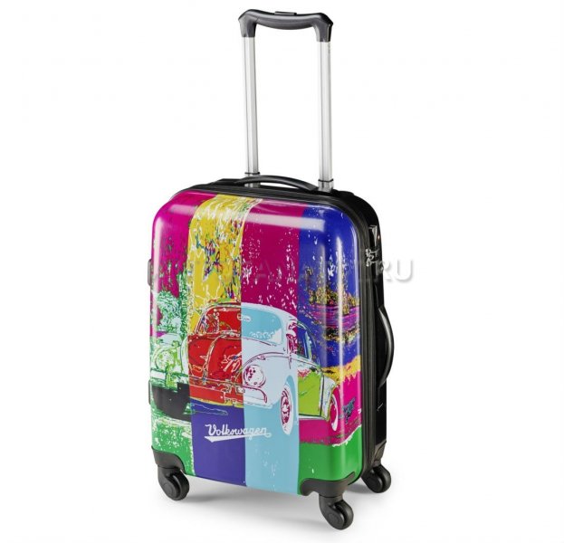 Классика встречает поп-арт! Этот практичный чемодан на 4-х колесиках и телескопической ручкой сочетает в себе искусство, классику и комфорт. На боковой панели многоцветный принт с мотивом легендарного Жука в стиле поп-арт и историческая надпись Volkswagen. Внутри сетчатый карман, разделитель и упаковочные ремни обеспечивают хорошо продуманное пространство для Вашего багажа.