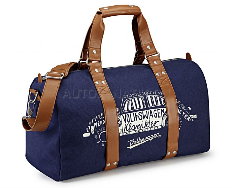 Наслаждайтесь отдыхом в выходные дни со стильным багажом! Сумка из коллекции Classic: с одной стороны рисунок со стилизованным изображением легенадрного "жука", а с другой стороны - нашивка с историческим логотипом Volkswagen. Сумка изготовлена из прочной ткани синего цвета, а ручки и плечевой ремень из искусственной кожи.