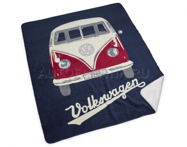 Высококачественный флисовый плед с цветным принтом легендарного хиппи-мобиля Volkswagen T1 Bulli. Оборотная сторона одноцветная - кремово-белая. Размер: 130 х 150 см. Материал: 100% полиэстер.