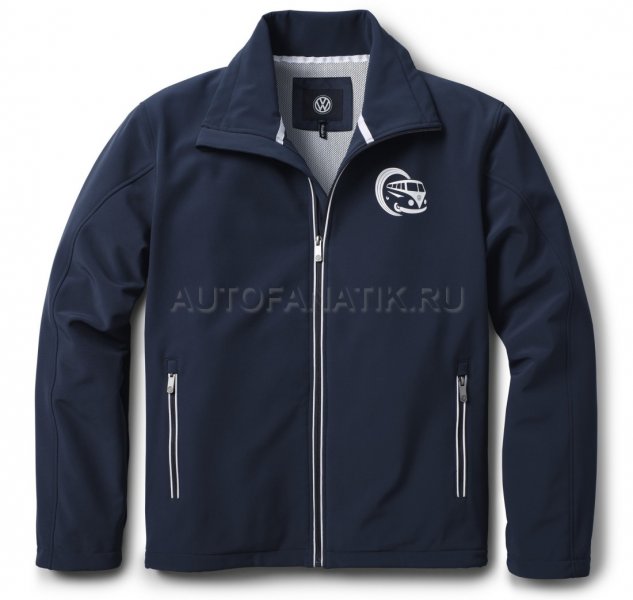 Куртка из материала софтшелл. На груди изображение легендарного микроавтобуса T1 Bulli. Боковые карманы на молнии. Цвет: тёмно-синий. Материал: 100% полиэстер.