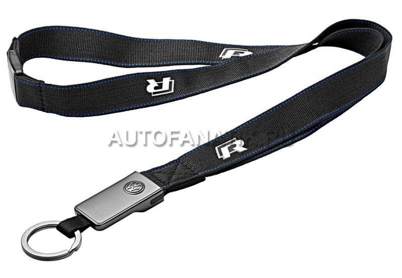 Оригинальный шнурок для ключей с надписью R и металлическим кольцом для ключей или бейджа. Материал ленты: полиэстер. Цвет: черный.