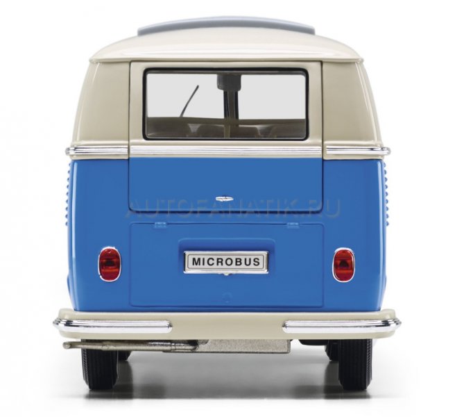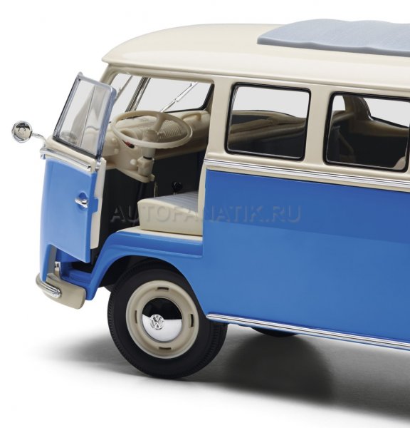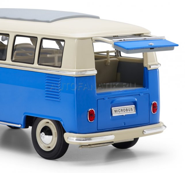 Модель автомобиля Volkswagen T1 Samba Van в версии 1962 года. Передние двери и дверь багажника открываются. Масштаб: 1:18. Производитель: Welly. Цвет: синий/кремовый. Артикул: 231099302 LRD