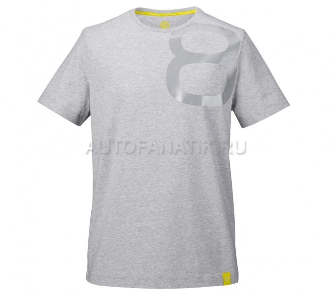 Мужская футболка с круглым вырезом, традиционный крой. Однотонный джерси светло-серого цвета. Большой логотип с цифрой 8, выполненный в специальной технике печати, в честь Golf восьмого поколения. Желтая лента внутри воротникас вышитой белой надписью Volkswagen. Квадратная желтая бирка с белым логотипом VW слева внизу. Материал: 100% хлопок. Цвет: светло-серый меланж. Сделано в Португалии.