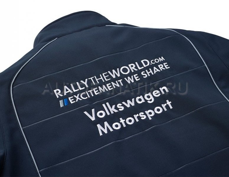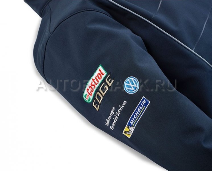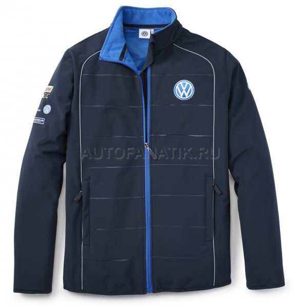 Вызывающая, спортивная - мужская куртка софтшелл из коллекции Volkswagen Motorsport. На груди вышитый логотип VW, на рукавах вышитые логотипы спонсоров раллийной команды Volkswagen. На спине крупная вышивка на тему ралли. Материал: софтшелл. Цвет: темно-синий с ярко-синими контрастными элементами.