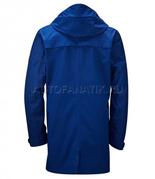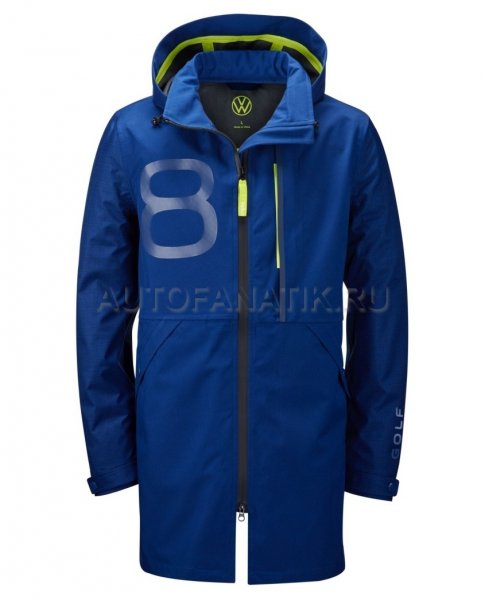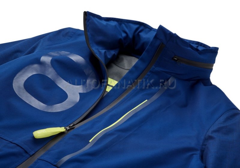Короткое, модное, спортивное пальто - непромокаемое, из легких материалов, без подкладки. Рукава с перекрестной штриховкой. Большой принт «8» тон в тон справа на груди. Выпущено в честь автомобиля Golf восьмого поколения. Все внутренние основные швы прострочены желтыми лентами. Капюшон интегрирован. С двумя внешними карманами, один на груди на молнии. Рукава оканчиваются тесьмой на липучке для регулировки ширины. Текстильная молния с надписью Volkswagen. Сплошная надпись Volkswagen по внутреннему краю капюшона. Материал: 100% полиэстер. Цвет: синий.