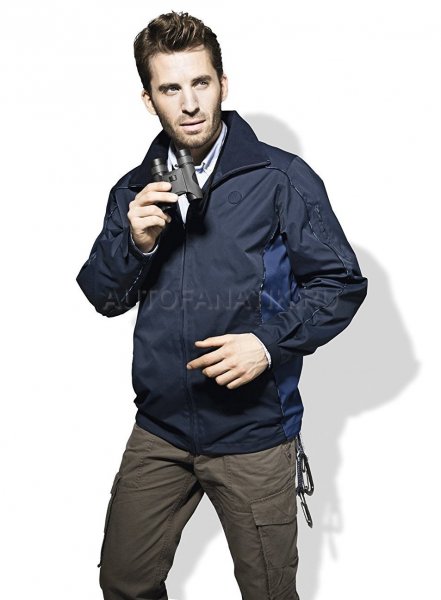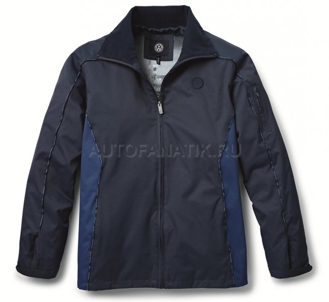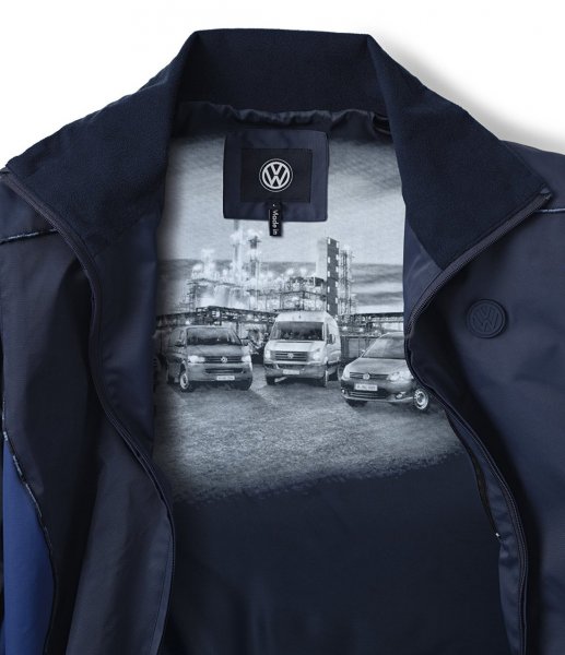 Мужская куртка из коллекции Volkswagen "Nutzfahrzeuge" (нем. "Коммерческий транспорт"). Демисезонная куртка для защиты от ветра и дождя, прочная и универсальная. Воротник-стойка с внутренней стороны подбит флисом, втачные карманы на молнии, рукава и низ регулируются по размеру. Окантовка швов печатной надписью «Volkswagen Nutzfahrzeuge» на разных языках. Сложная печать на внутренней подкладке: панорамный рисунок коммерческих автомобилей. Материалы: верх 100% полиамид, подкладка: 52% полиэстер, 48% вискоза, рукава: 100% полиэстер. Цвет: тёмно-синий.