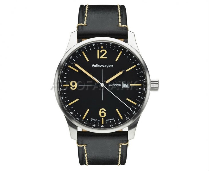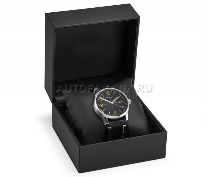 Черный циферблат с тонкой надписью Volkswagen и отображением даты. Часовая и минутная стрелки - флуоресцентные. Черный прошитый контрастными нитками браслет выполнен из тончайшей свиной кожи, а на короне есть логотип Volkswagen. Застежка: нержавеющая сталь. Диаметр корпуса: 42 мм. Водонепроницаемость: до 10 ATM. Поставляются в элегантной подарочной коробке с логотипом VW. Производство: Германия.