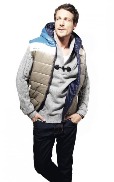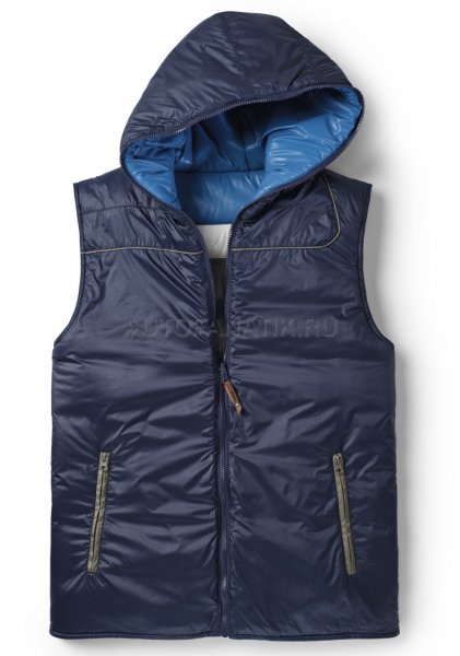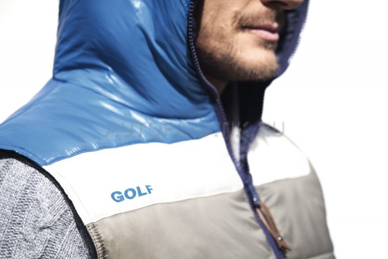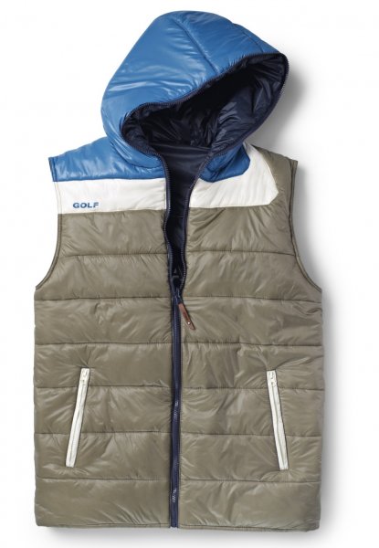 Мужской двухсторонний жилет с утеплителем из вторичного полиэстера и переработанной кофейной гущи. У жилета имеется сплошная застёжка-молния, проходящая также и по капюшону. Кроме того, имеются два боковых кармана на молнии. Бегунок молнии из искусственной кожи украшен тиснёной надписью "Golf". Спереди и сзади жилет также украшен логотипом "Golf".