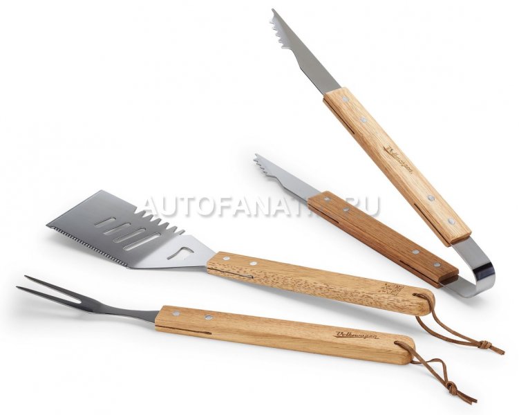 Оригинальный набор Volkswagen для гриля - то что надо для дачи или выездов на природу! Состав набора: лопатка, вилка для мяса и щипцы. Гравировки на деревянных ручках, полированная нержавеющая сталь. Лопатка для гриля с вырезом и открывалкой для бутылок.