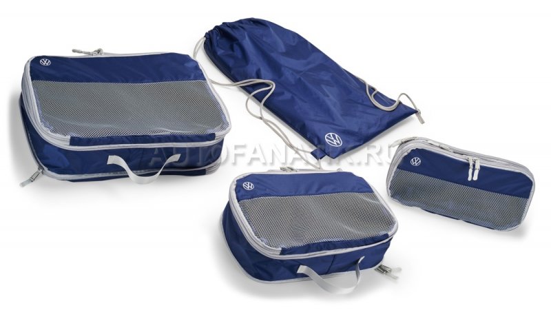 Набор из четырех сумок Volkswagen - для создания порядка в вещах во время путешествий. Темно-синий основной материал с серой сеткой и серыми молниями, а также белый принт логотипа Volkswagen на всех предметах. Состоит из трех сумок разного размера и одной сумки на шнурках. Сумки можно уменьшить по высоте с помощью круговой молнии, которая уменьшает объем упаковки. Большая сумка имеет две стороны, одна из которых внутри водонепроницаема.