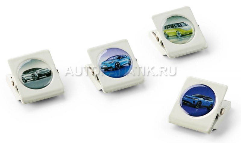 Набор из четырех металлических магнитов. С функцией зажима. С четырьмя различными мотивами автомобилей новейшего семейства электромобилей Volkswagen ID. Размер магнита: 3,6 х 3 х 2,1 cм. Основной цвет: серый. Материал: металл.