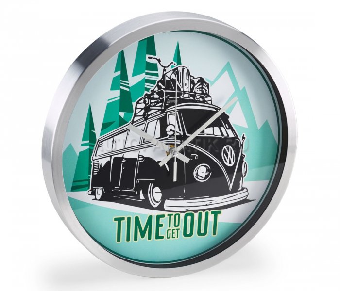 Настенные часы с рамкой и картинкой на тему легендарного T1 с багажником на крыше. Это призыв к путешествиям! Горы на заднем плане. Стеклянный фасад, металлический каркас. Кварцевый механизм. Диаметр: 30 см. Цвет: хром / зеленый / черный / белый.