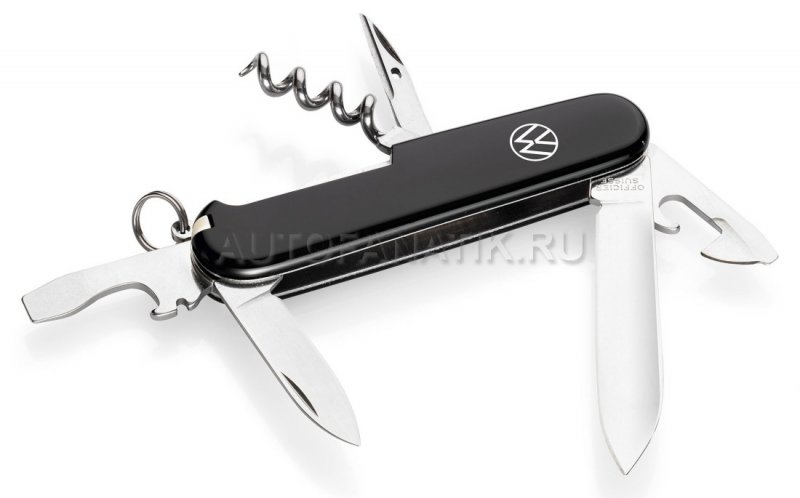 Перочинный нож-мультиинструмент Volkswagen с кольцом для ключей. Поставляется в чехле. Длина лезвия: 91 мм. Инструменты: лезвие из нержавеющей стали, консервный нож с маленькой крестообразной отверткой, открывалка для бутылок с отверткой (минусовая), штопор, пинцет, зубочистка. Производитель: Victorinox. Производство: Швейцария. Информация о материале: пластик, металл.