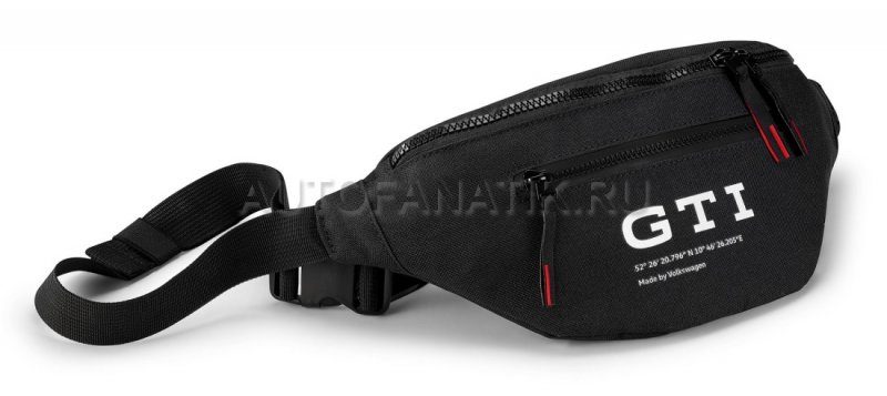 Два отделения на молнии - основное и фронтальное. Ремешки на собачках молний с контрастными красными полосками. Передний карман на молнии с красным контрастом. Регулируемая длина ремешка. Надпись GTI белого цвета спереди. Информация о материале: 100% полиэстер. Черный цвет. Размеры: 33 х 15 х 8 см.