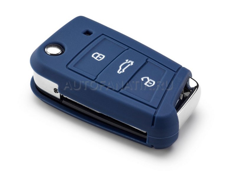 Силиконовый чехол для ключа темно-синего цвета, с обновленным рельефным логотипом Volkswagen белого цвета. Чехол подходит для 3-кнопочного ключа Golf VII MQB. Отлично защитит ключи автомобиля от царапин и загрязнений.