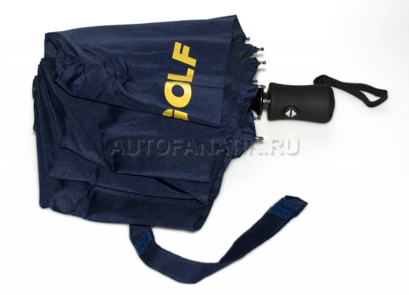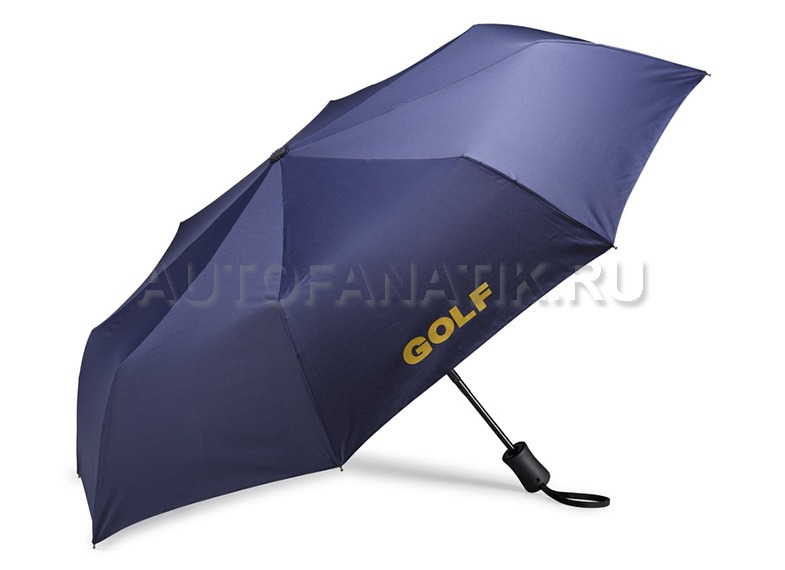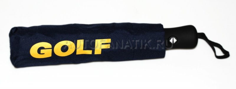 Легкий, компактный складной зонт-автомат Volkswagen Golf. Купол синего цвета с желто-оранжевой матовой надписью GOLF. Удобная пластиковая рукоятка. Диаметр купола около 90 см. Чехол в комплекте.
