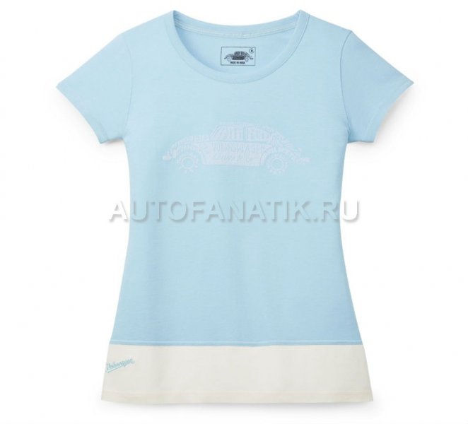 Привлекательная женская футболка в бирюзовом и бежевом цветах разрезана по бедрам и сшита. На груди принт - стилизованный "Жук", состоящий из надписей внутри рисованного кузова. В нижней части на бежевом фоне размещен прописной ретро-логотип Volkswagen. Материал: 95% хлопок, 5% эластан. Материал: 100% хлопок. Цвет: бирюзовый/бежевый.