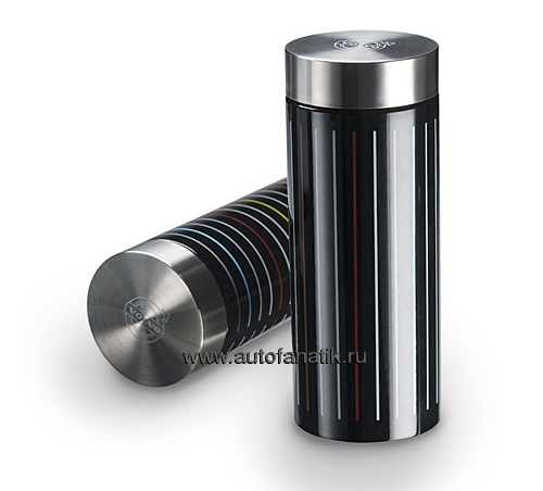 Термос из нержавеющей стали, емкостью 0,5 л. с винтовой пробкой. В комплект поставки входит 2 термоса. Горизонтальный или вертикальный рисунок - разноцветные полосы. Лготип Volvo выгравирован на крышке.